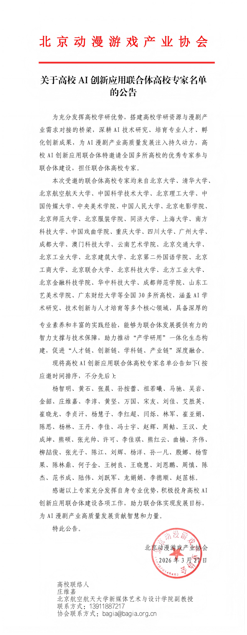 关于高校 AI 创新应用联合体高校专家名单的公告